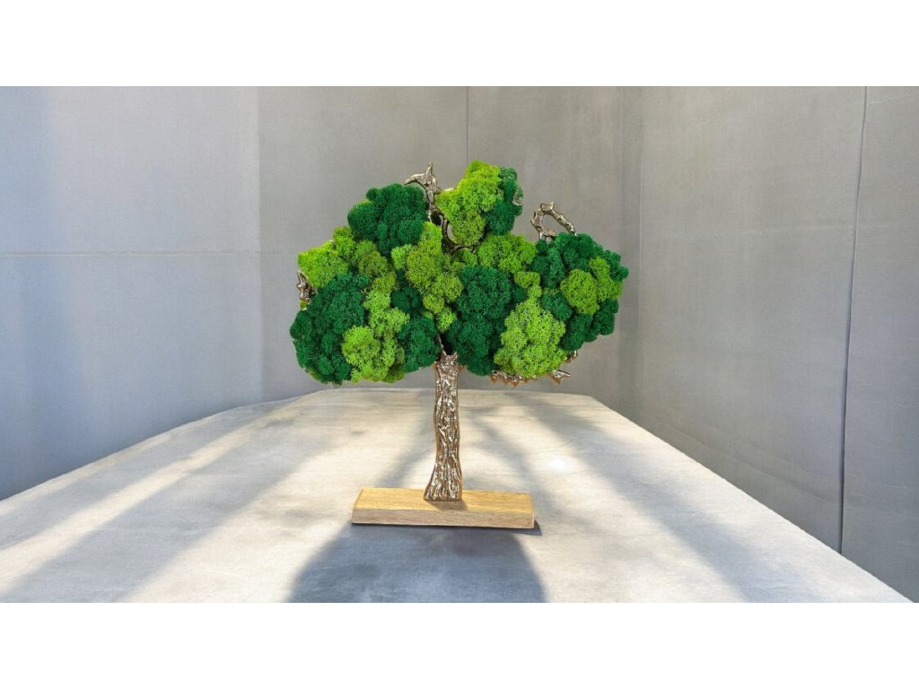 Tento strom působí jako umělecký kousek spojující přírodní a moderní prvky. Má zlatavý kmen s realistickými detaily připomínajícími skutečnou kůru a bohatou korunu z finského sobího mechu v různých odstínech zelené. Je usazen na jednoduché dřevěné základně, která celku dodává stabilitu a podtrhuje jeho přírodní charakter.